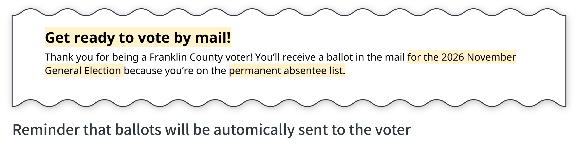 For reminder mailers, focus the message on providing information to the voter and collecting updates if any of their information has changed.