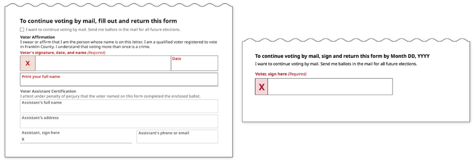 Voters in states that require reapplication must generally complete the full application to continue voting by mail. Instead, it might be possible for a checkbox to serve as a full application, like in the example above.