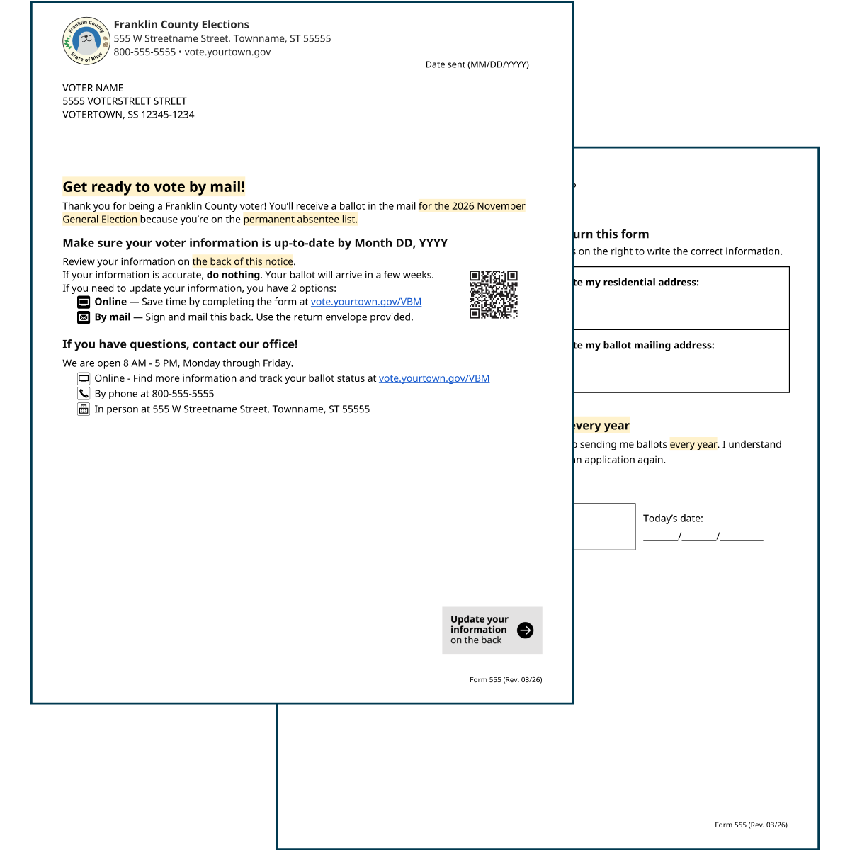 The tone of these mailers can be more relaxed and informative. The notice can even serve additional purposes—remind the voter when they can expect their mail ballot, collect updates to voter information, and provide an opportunity to be removed from the list.